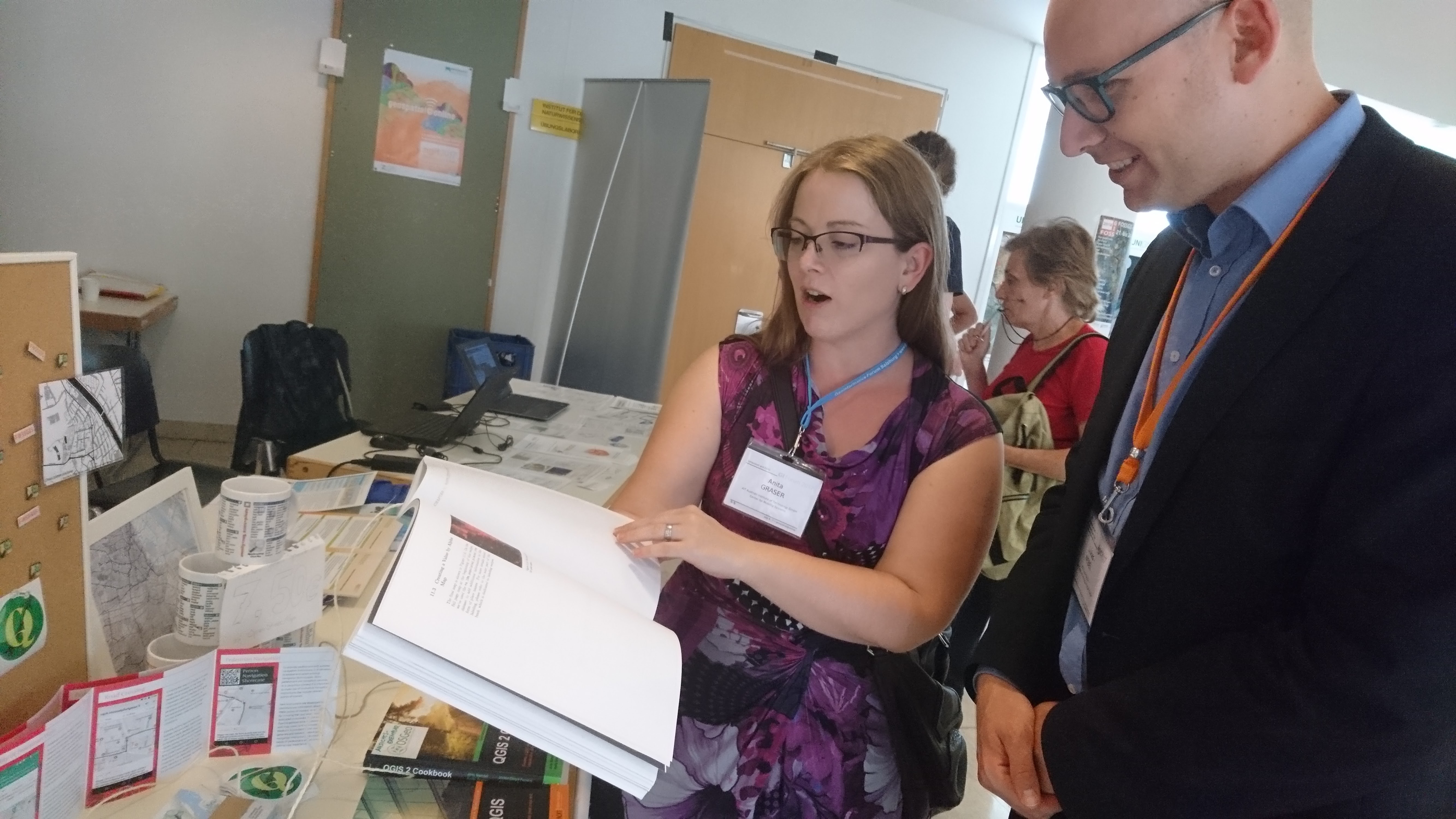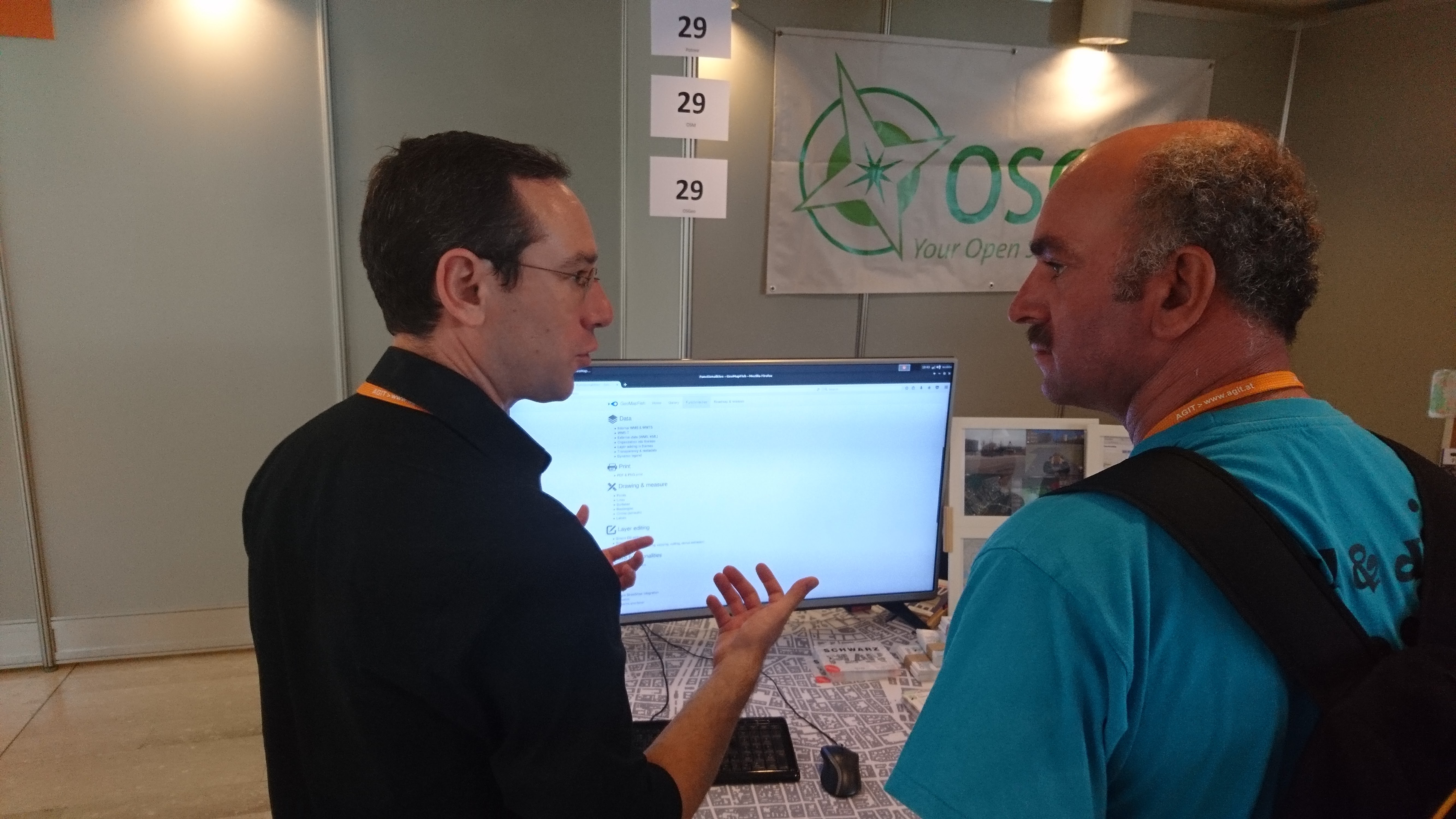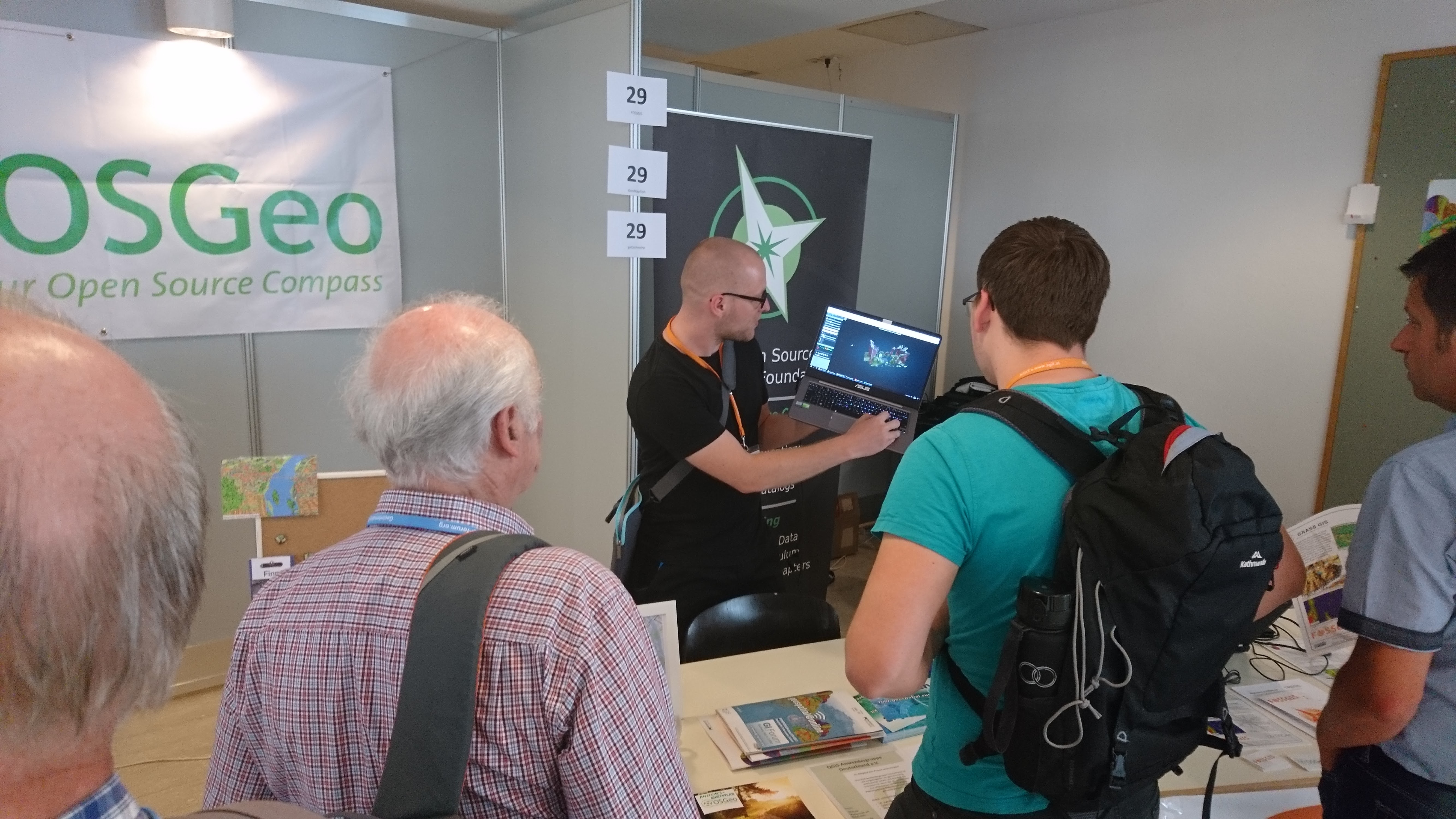Unfortunately, the Wi-Fi connection had to be re-established about every half hour, which was disruptive for the continuous operation of the Show Me the Way page on the flat screen. Possibly a stable LAN connection could be organised for next year, because otherwise the Wi-Fi sometimes failed exactly at the moments of the breaks when most visitors were visiting the OSGeo area.